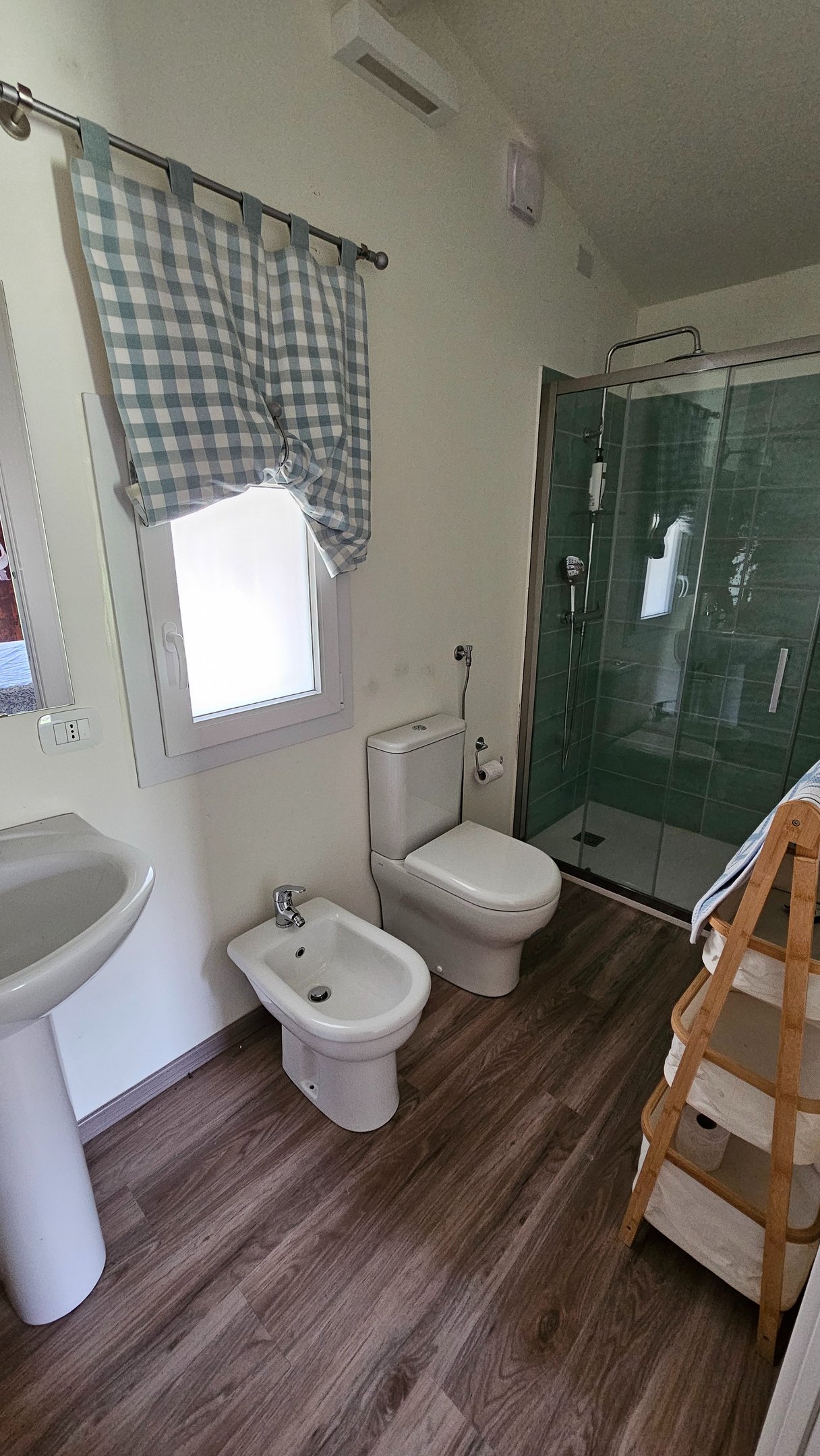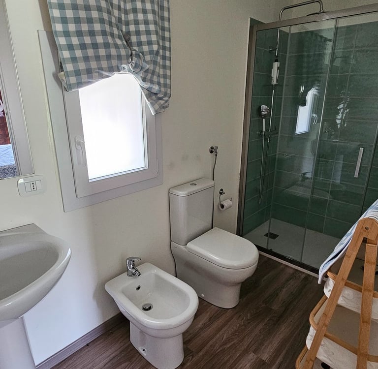 The house is divided into two levels. On the ground floor, we have a fabulous living-dining room with an accessible kitchen and a bathroom.